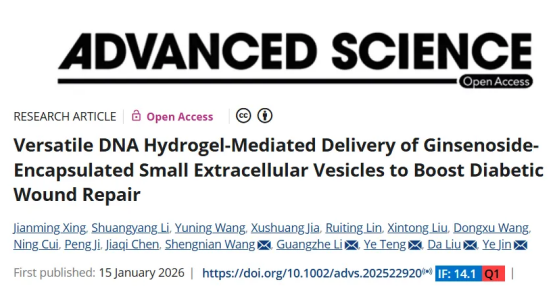 近日,学校金叶教授等科研团队在国际顶尖期刊《Advanced Science》(IF=14.1)上发表题为“Versatile DNA Hydrogel-Mediated Delivery of Ginsenoside-Encapsulated Small Extracellular Vesicles to Boost Diabetic Wound Repair”的研究论文,开发了一种DNA适配体水凝胶递送负载人参皂苷的干细胞外囊泡,用于治疗糖尿病伤口愈合。东北亚中医药研究院科研助理邢建铭、2022级药剂学研究生李双阳为该论文第一作者,王胜年、李光哲、滕叶、刘达、金叶为该论文共同通讯作者,长春中医药大学为论文第一完成单位。