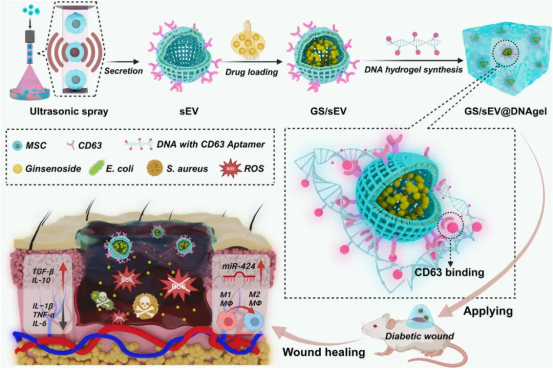 糖尿病伤口愈合过程经常出现预后不佳、恢复时间长和高复发率等问题。本研究提出了一种多功能DNA水凝胶载药系统,用于加速糖尿病伤口愈合。研究团队创新开发了一种超声刺激技术,以促进干细胞外囊泡的大规模生产。通过改变膜的流动性、钙离子水平和相关蛋白表达,该方法使细胞外囊泡的生产量提升了57.7倍。人参皂苷具有天然的抗菌与抗炎特性,但其治疗应用受限于低溶解性。因此,研究团队通过优化反复冻融法,将人参皂苷装载干细胞外囊泡中用于药物递送。为实现伤口愈合过程中药物持续释放,团队研发了一种DNA水凝胶,其通过适配体CD63将载药囊泡锚定,形成多功能水凝胶载药平台“GS/sEV@DNAgels”。
